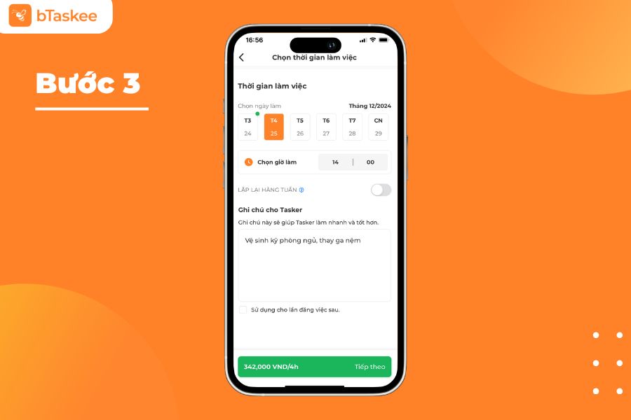 Khi đặt lịch trên ứng dụng, hãy sử dụng mục ghi chú để liệt kê cụ thể các công việc bạn muốn chị Ong thực hiện. Ví dụ: “Lau dọn bếp, vệ sinh phòng khách, thay ga trải giường.”