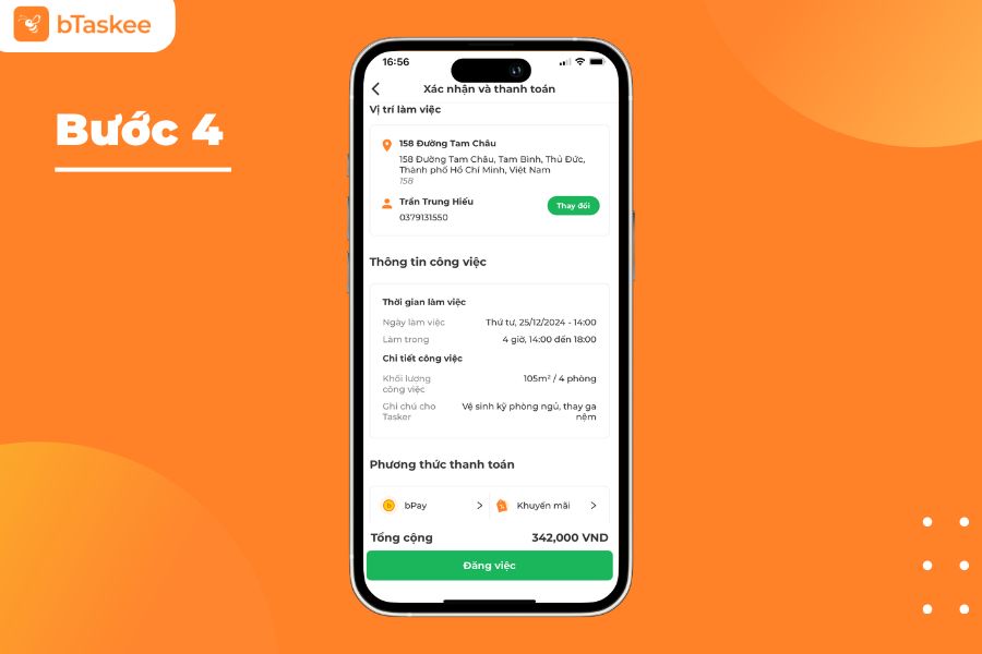 - Giá dịch vụ giúp việc sẽ được hiển thị chính xác nhất khi khách hàng đặt lịch trực tiếp trên ứng dụng bTaskee, đảm bảo tính minh bạch tuyệt đối.