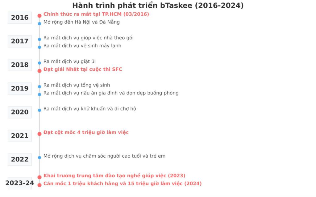 Từ năm 2016, bTaskee đã tiên phong ứng dụng công nghệ vào ngành giúp việc nhà tại Việt Nam. Sau 9 năm phát triển, bTaskee đã trở thành thương hiệu uy tín với những cột mốc đáng nhớ: