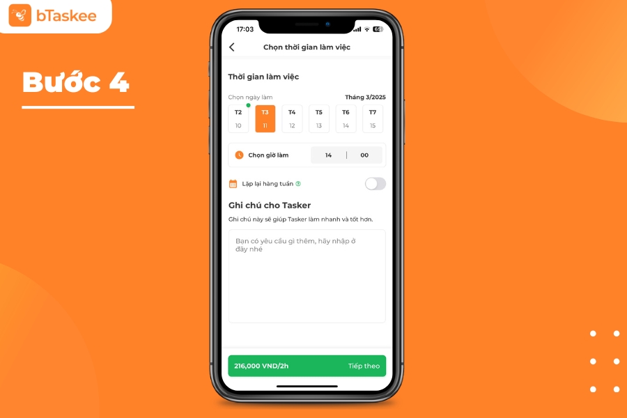 - Nên đặt lịch trước ít nhất 24 giờ để tăng khả năng tìm được Tasker phù hợp.