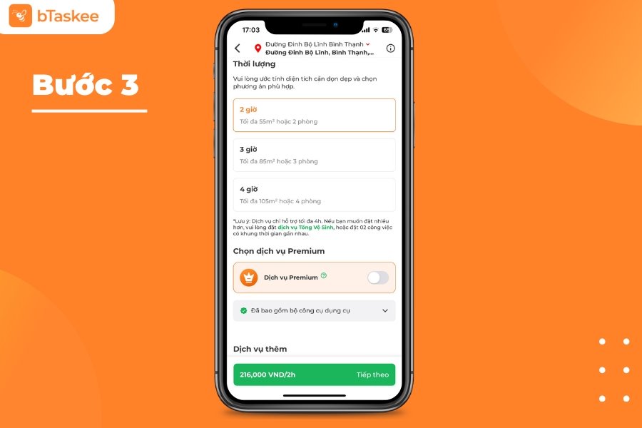 Bước 3: Chọn số giờ và dịch vụ kèm theo