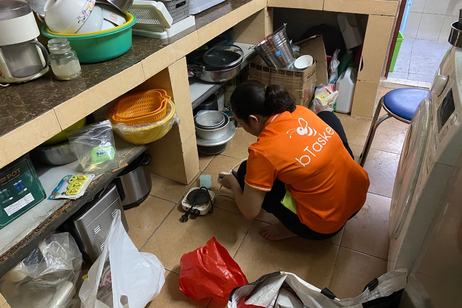 - Nhà bếp: Tasker lau chùi bàn bếp, tủ, vệ sinh lò vi sóng, tủ lạnh (bên ngoài), rửa chén bát, lau quạt hút mùi. Khu vực này được làm sạch kỹ để loại bỏ dầu mỡ.