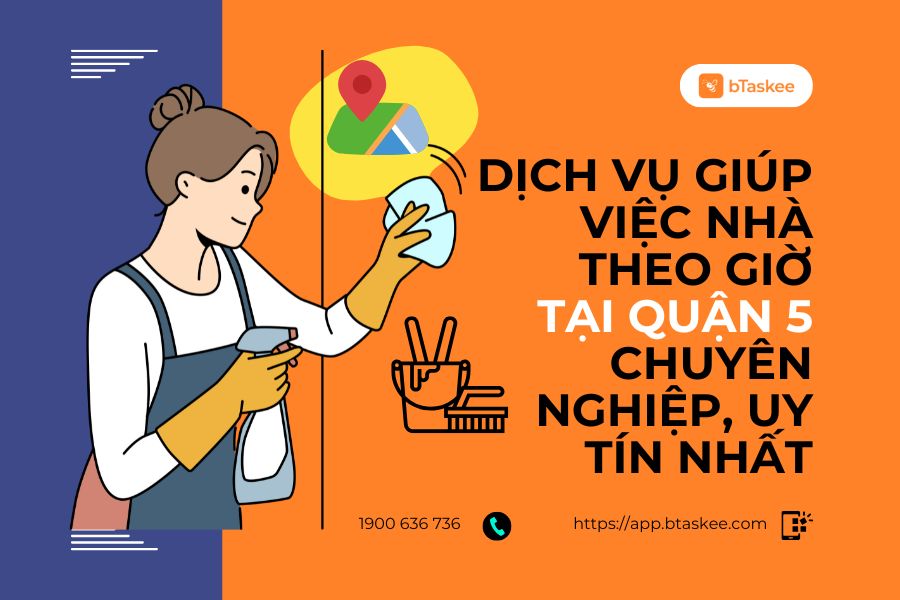 bTaskee cung cấp dịch vụ giúp việc nhà theo giờ tại Quận 5 với đặc điểm vượt trội về tính linh hoạt, minh bạch và hiệu quả chi phí. Là thương hiệu dịch vụ gia đình hàng đầu với hơn 9 năm kinh nghiệm, bTaskee mang đến giải pháp tiết kiệm thời gian và chi phí thông qua hệ thống đặt lịch trực tuyến đơn giản trên ứng dụng, thanh toán theo giờ sử dụng thực tế và đội ngũ “Ong Cam” được đào tạo chuyên nghiệp.