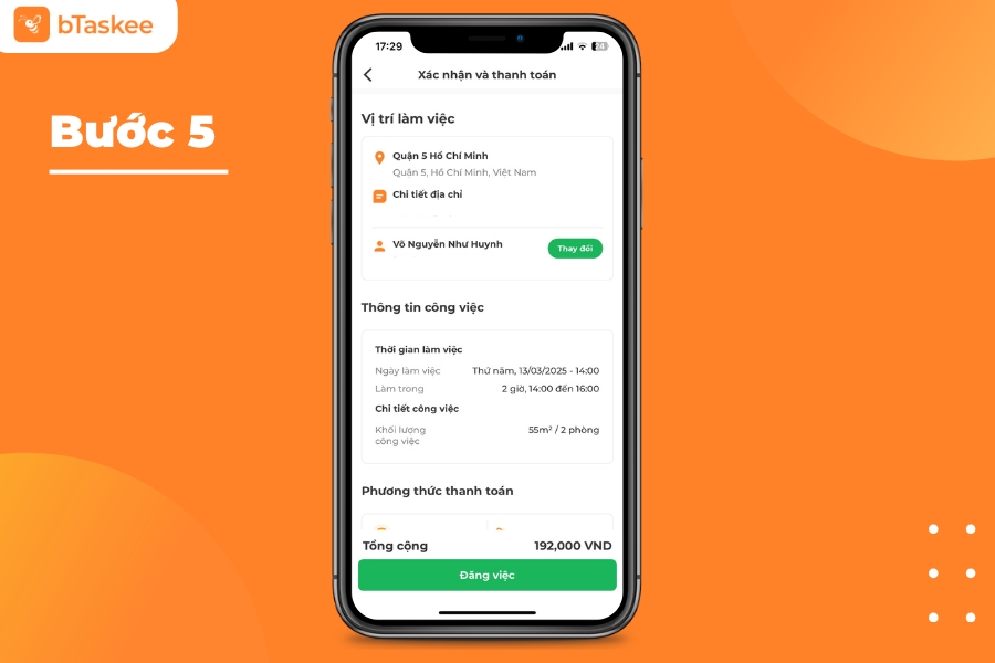 Mẹo: Thanh toán trực tuyến sẽ giúp bạn tiết kiệm thời gian và không cần chuẩn bị tiền mặt. Hãy để lại đánh giá chi tiết để Tasker có thể cải thiện dịch vụ trong những lần tiếp theo.