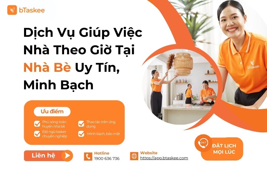 Dịch vụ giúp việc theo giờ tại Nhà Bè của bTaskee nổi bật với đội ngũ Ong Cam chuyên nghiệp, giá cả minh bạch, bảo mật thông tin tuyệt đối và quy trình đặt lịch nhanh chóng qua ứng dụng.