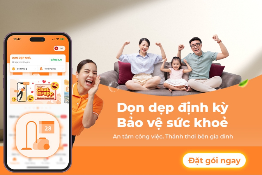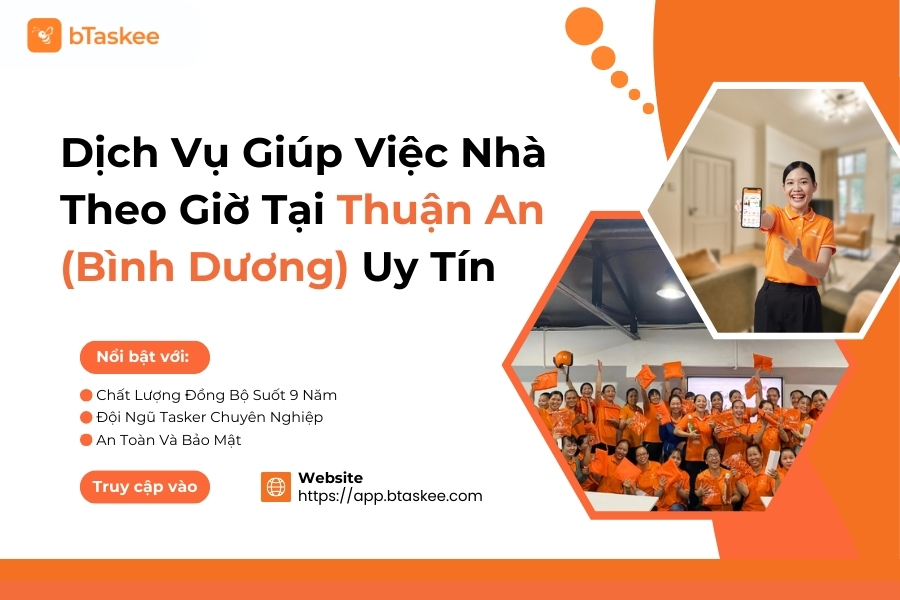 Dịch vụ giúp việc theo giờ bTaskee đáp ứng nhu cầu tại Thuận An thông qua hệ thống đặt lịch nhanh chóng qua ứng dụng, đội ngũ Tasker chuyên nghiệp được tuyển chọn và đào tạo bài bản, cùng quy trình làm việc chuẩn mực đã được kiểm chứng qua 9 năm hoạt động.