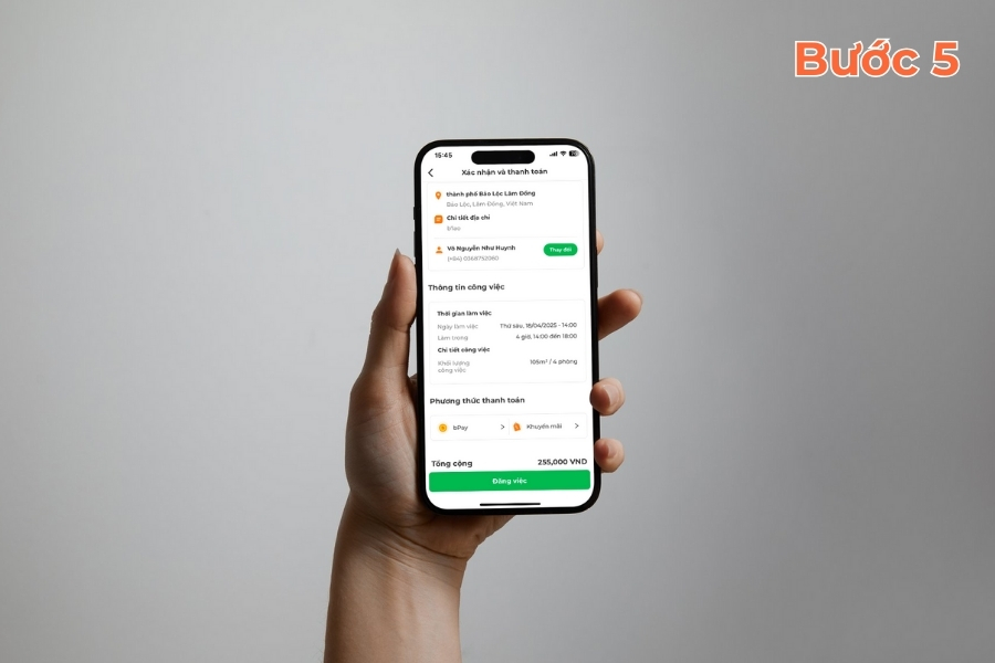 Sau khi xác nhận đặt lịch, hệ thống sẽ tự động tìm Tasker phù hợp trong khu vực. Khi có người nhận việc, khách hàng sẽ được thông báo kèm theo thông tin và đánh giá của Tasker. Trước giờ làm, người giúp việc sẽ chủ động liên hệ để xác nhận lại thời gian và địa điểm.