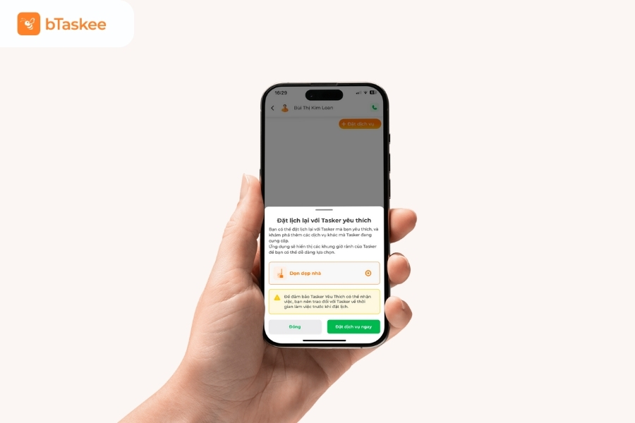 Sau khi hoàn tất đặt lịch, bạn sẽ nhận được thông báo khi có Tasker nhận việc. Thông tin của Tasker sẽ được hiển thị trên ứng dụng, bao gồm hình ảnh, đánh giá và số lần làm việc trước đó.