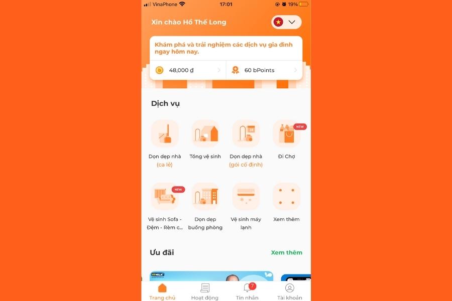 Sau khi đăng nhập bạn có thể tùy chọn các dịch vụ như dọn dẹp nhà, tổng vệ sinh, dọn dẹp buồng phòng.