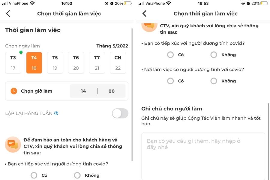 Khai báo về việc tiếp xúc với người có Covid để đảm bảo an toàn và ghi chú cho người làm nếu có.