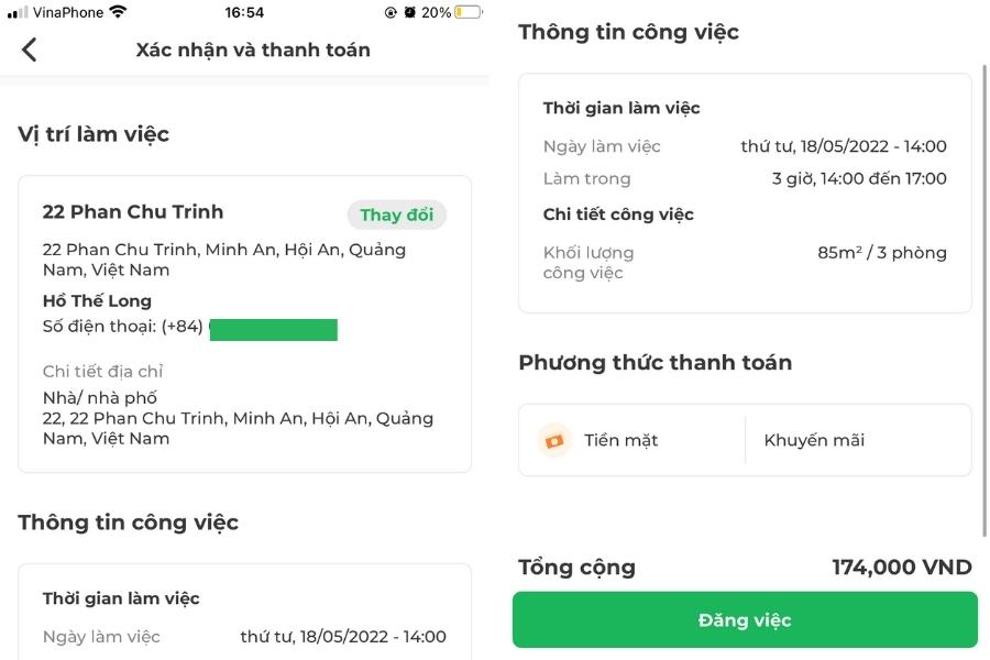 Sau khi đã chọn địa điểm, phương thức thanh toán và khuyến mãi thì bạn chọn Đăng việc. Đến đây đã hoàn tất quá trình đặt lịch dọn dẹp việc nhà, chúc các bạn có trải nghiệm tốt từ ứng dụng.