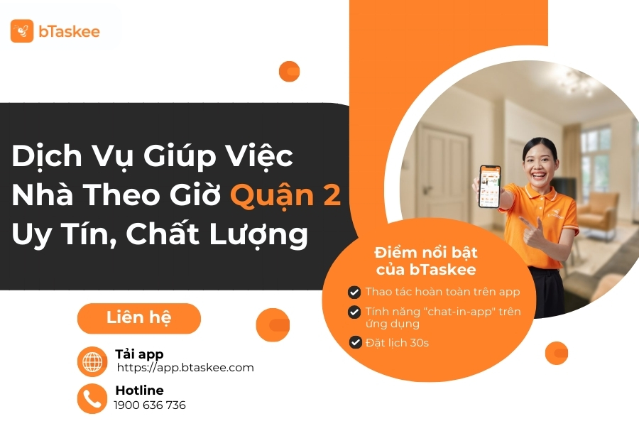 Dịch vụ giúp việc theo giờ của bTaskee được tối ưu cho căn hộ chung cư và biệt thự tại Quận 2 cũ. Chẳng hạn, với một căn hộ 80m² tại Thảo Điền, Tasker sẽ đến đúng giờ, mang theo dụng cụ chuyên dụng, xác nhận công việc và vệ sinh theo quy trình khoa học—từ trên xuống dưới, từ trong ra ngoài.