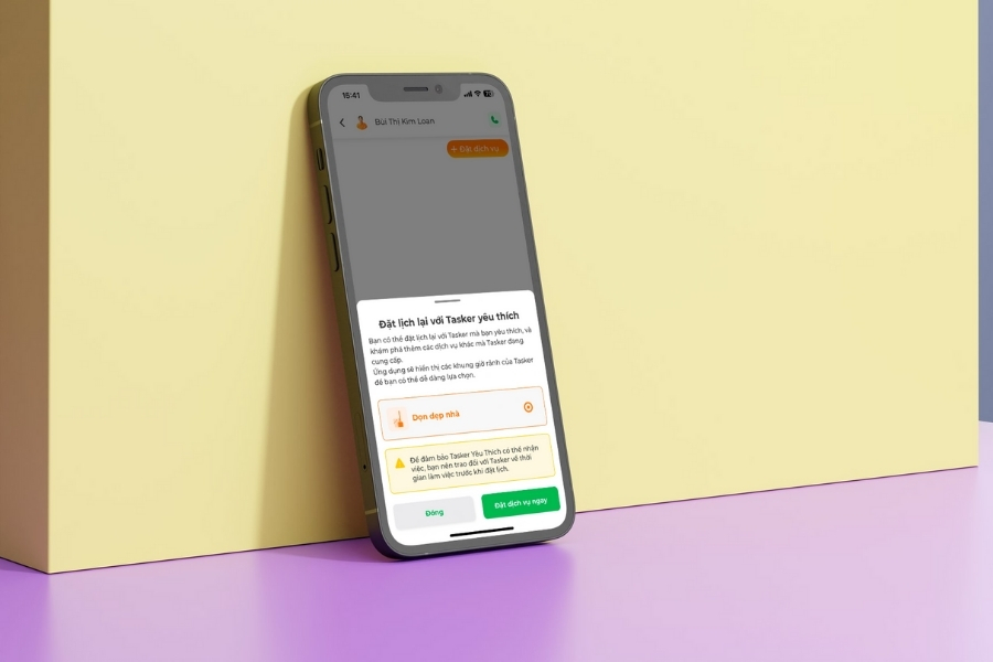 Sau khi đặt lịch, khách hàng sẽ nhận được thông báo xác nhận qua ứng dụng. Tasker sẽ liên hệ trước khi đến để xác nhận thời gian. Sau khi dịch vụ hoàn tất, khách hàng có thể đánh giá chất lượng trực tiếp trên ứng dụng bằng xếp hạng sao (1-5) và nhận xét.