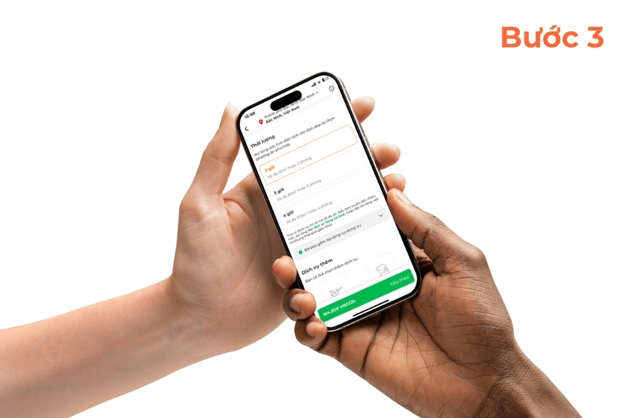 - Chọn số giờ dọn dẹp tùy theo diện tích nhà: 2, 3 hoặc 4 giờ
