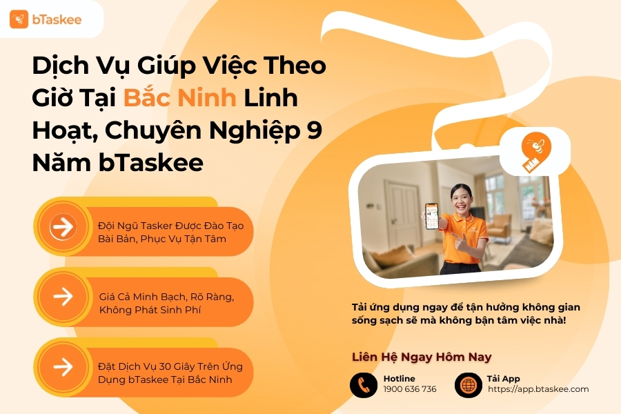 Dịch vụ giúp việc theo giờ của bTaskee tại Bắc Ninh mang đến giải pháp tiện lợi, chất lượng và phù hợp với nhịp sống hiện đại của người dân địa phương. Với 9 năm kinh nghiệm, đội ngũ Tasker chuyên nghiệp và am hiểu văn hóa địa phương, cùng quy trình làm việc chuẩn mực, bTaskee cam kết mang đến trải nghiệm dịch vụ tốt nhất cho mỗi khách hàng.