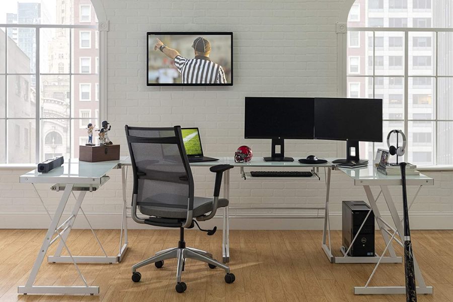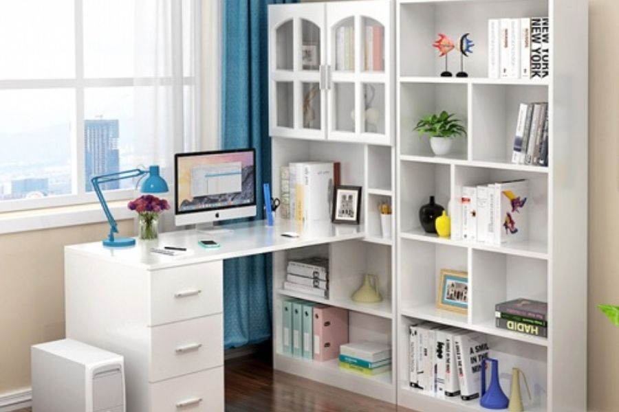 Thiết kế hiện đại với gam màu trắng chủ đạo mang đến một không gian làm việc thoáng đãng cho bạn. Bàn làm việc tối giản với thiết kế chữ L là lựa chọn số 1 hiện nay với những không gian nhỏ.