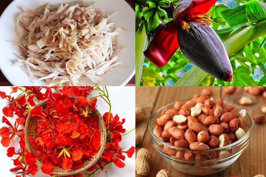 - Hoa phượng tách rời từng cánh, hoa chuối bào mỏng. Ngâm cả 2 loại hoa này vào nước muối loãng để loại bỏ vi khuẩn.