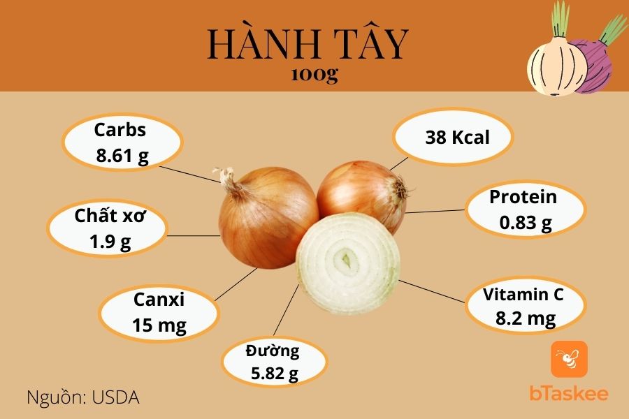 Hành tây rất giàu chất dinh dưỡng. Nó có hàm lượng calo thấp nhưng chứa nhiều vitamin và khoáng chất như vitamin C, vitamin B, kali,…Theo Bộ Nông nghiệp Hoa Kỳ, trong 100 gram hành tây bao gồm:
