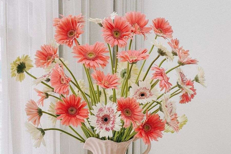 Những bông hoa đồng tiền khi trưng trong phòng khách mang lại cảm giác tươi mới, sáng bừng không gian với những sắc hoa nổi bật.
