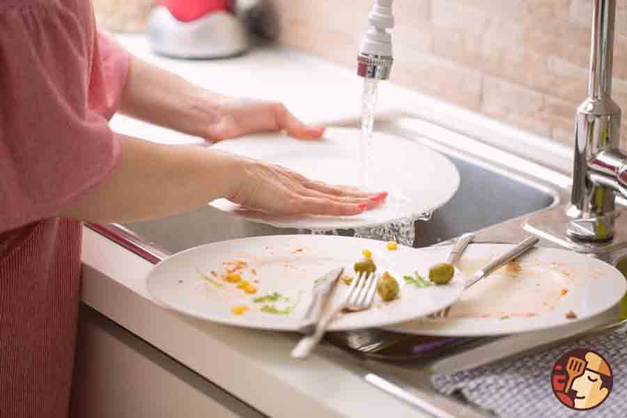Bước làm này cũng khá quan trọng, nó sẽ giúp bạn loại bỏ thức ăn còn sót lại, dầu mỡ trên dĩa. Giúp bước rửa chén tiếp theo sẽ dễ dàng hơn.