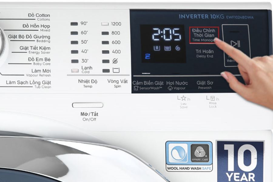 - Nút Adjust Time: Hướng dẫn sử dụng máy giặt Electrolux 10kg có nút Adjust Time, có tác dụng điều chỉnh lại chương trình giặt mặc định.