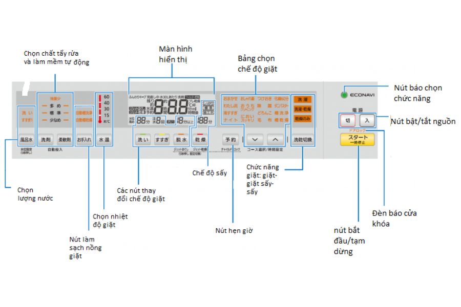 Nắm được bảng điều khiển của máy sẽ giúp người dùng biết cách sử dụng máy giặt Panasonic nội địa Nhật một cách hiệu quả hơn. Dưới đây là chi tiết bảng điều khiển máy giặt Panasonic nội địa Nhật bằng tiếng Việt.