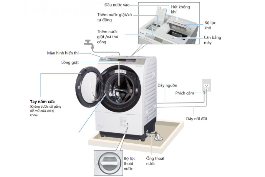- Phần trên: Đầu nước vào, bộ phận hút không khí, bộ lọc khô, cân bằng máy, vị trí để nước giặt, xả tự động, màn hình hiển thị.