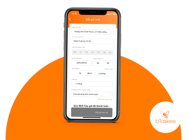 Điền các thông tin cần thiết như nơi làm việc, số nhà/căn hộ, thời gian mà bạn muốn lặp lại trong tuần, ngày bắt đầu gói tháng và chọn giờ làm việc cố định trong ngày. Bạn cũng sẽ phải ước lượng thời gian thực hiện công việc dọn dẹp. Đồng thời mô tả các công việc mà người giúp việc cần làm trong suốt thời gian đó. Tiếp đến chọn hình thức gói bạn mong muốn. Hiện tại, bTaskee cung cấp dịch vụ dọn dẹp nhà theo gói với ba mức: 1 tháng, 2 tháng và 3 tháng cho bạn lựa chọn.