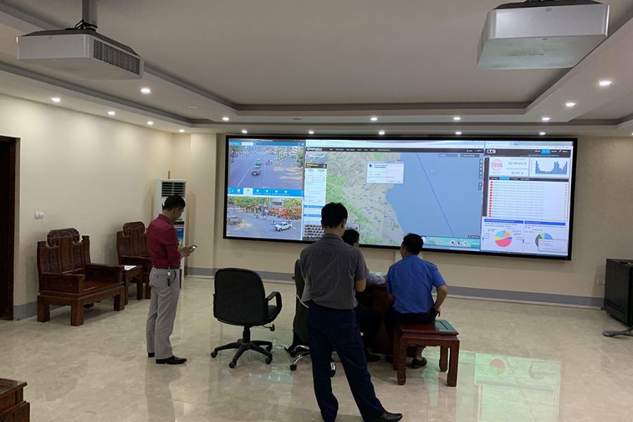 Khởi động máy chiếu, xuất hiện đèn màu xanh là máy chiếu đã được bật.