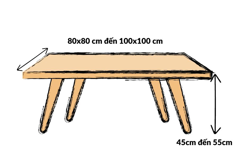 Loại thường chiều dài và chiều rộng từ 80cmx80cm đến 100cmx100cm, và độ cao thường từ 45cm đến 55cm. Bàn trà vuông thường là lựa chọn hoàn hảo cho các buổi tiệc hoặc các sự kiện tổ chức trong nhà.