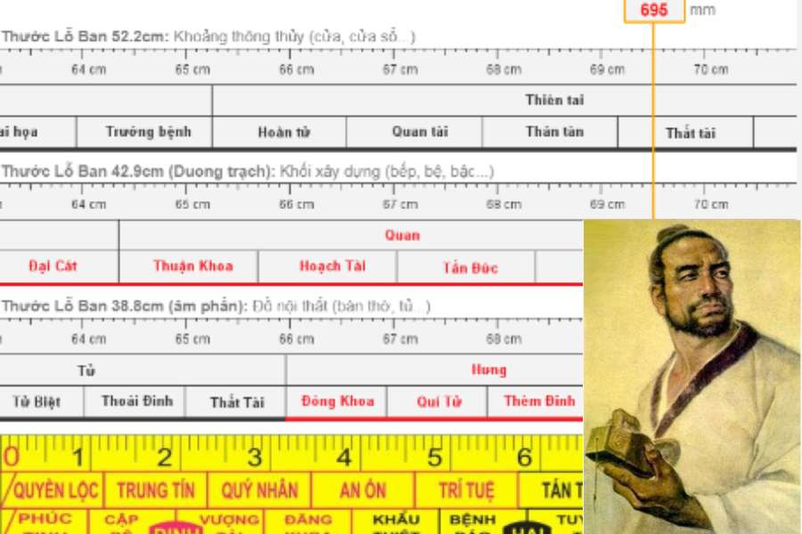 Thước lỗ ban 52,5cm được chia ra làm 8 cung lớn theo thứ tự như sau: Quý Nhân, Hiểm Họa, Thiên Tai, Thiên Tài, Nhân Lộc, Cô Độc, Thiên Tặc, Tể Tướng.