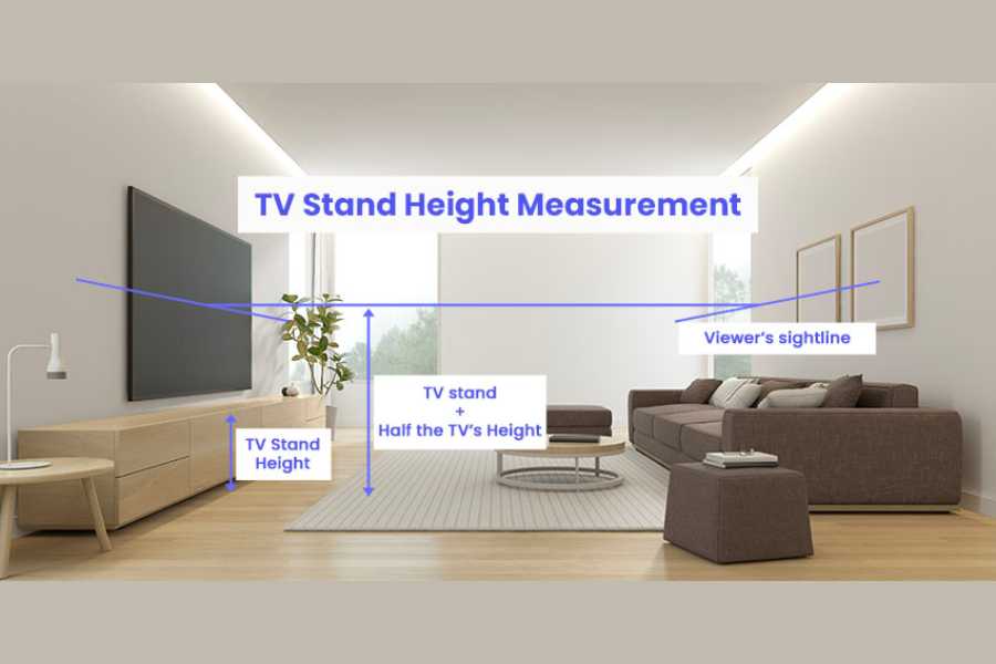 Để xác định chiều cao của kệ tivi, hãy ngồi trên ghế sofa và đo từ sàn nhà đến mắt. Để xem thoải mái, nửa dưới của màn hình tivi phải ngang tầm với tầm nhìn của bạn khi ngồi.
