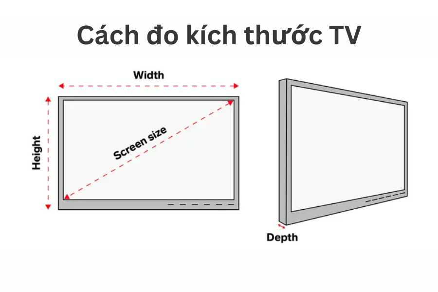Để tìm số đo kích thước kệ tivi phù hợp, hãy đo khoảng cách từ góc trên cùng bên trái của tivi đến góc dưới cùng bên phải.