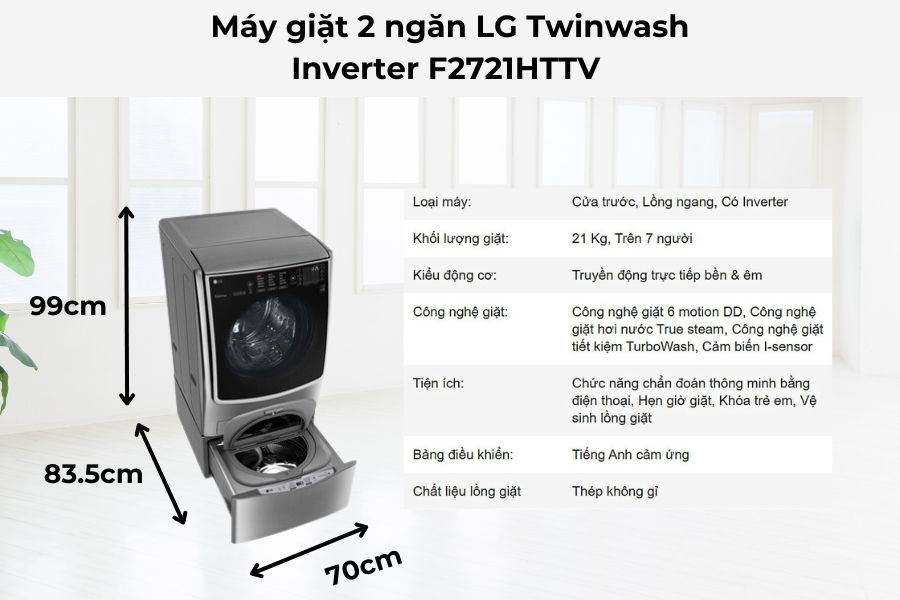 Máy giặt 2 ngăn (máy giặt lồng đôi) có cấu tạo gồm 2 lồng giặt riêng biệt, có thể sử dụng cùng lúc hoặc riêng lẻ đều được. Thông thường, máy giặt 2 ngăn sẽ gồm một lồng đứng và một lồng nằm ngang.