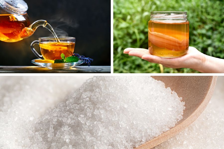 Thành phần chính để tạo nên Kombucha gồm trà hoặc nước trái cây, đường và con giấm Scoby.
