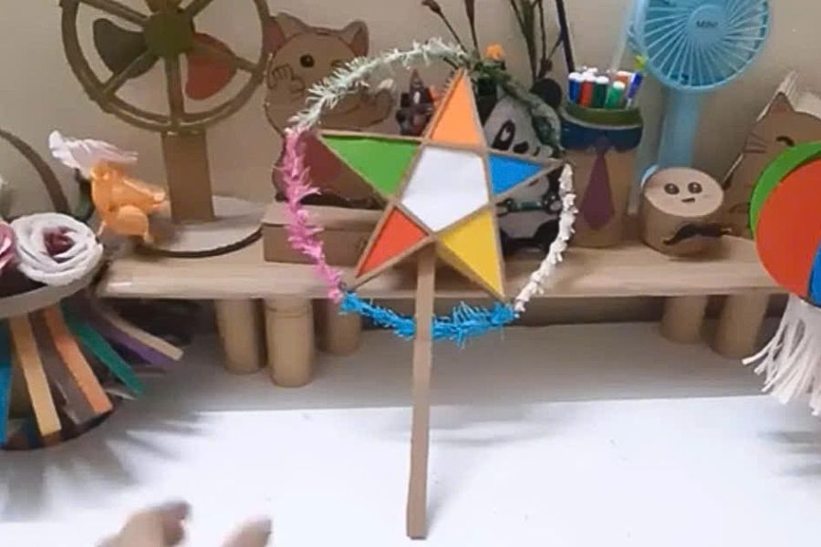 - Bước 9: Làm tay cầm, cắt bìa carton thành hình que, sao cho que thật cứng cáp và dùng keo cố định vào ngôi sao, bạn sẽ có ngay một chiếc đèn Trung thu bằng bìa carton hình ngôi sao.