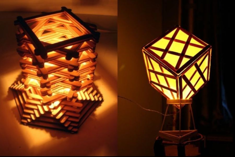 - Bước 5: Sử dụng 1 que kem gắn vào giữa để tạo chỗ buộc dây và làm phần cầm đèn lòng. Thêm đèn sặc sỡ vào để có được một chiếc đèn Trung thu bằng bìa carton hình trống cơm thật lung linh.