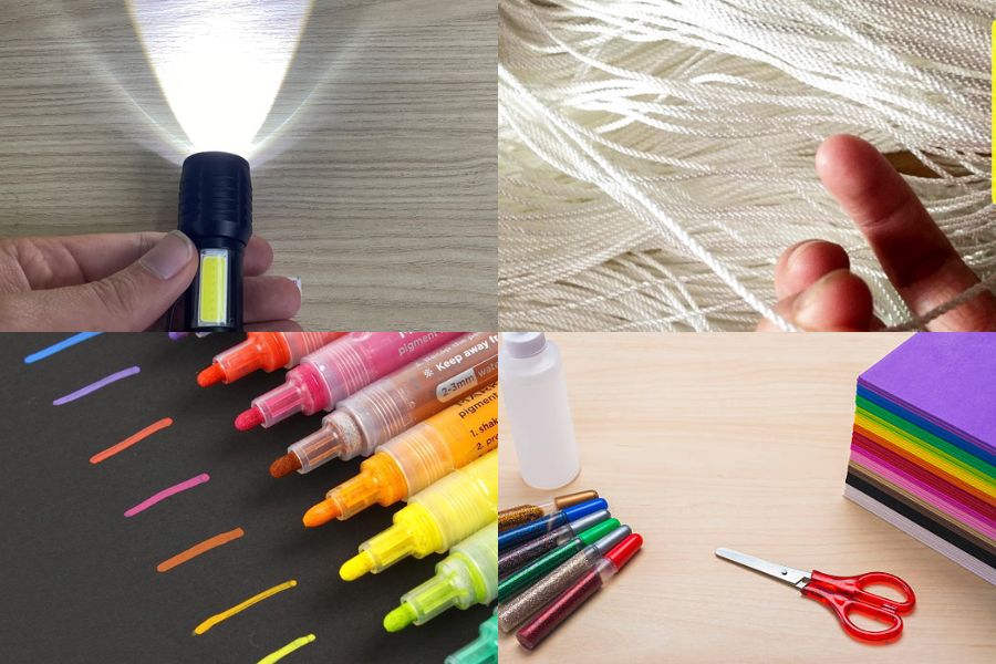** Lưu ý: Hãy buộc dây dù thật cân để nến không bị nghiêng, khi đó sẽ làm cháy đèn lồng. Nếu muốn an toàn, bạn nên dùng đèn pin nhỏ.