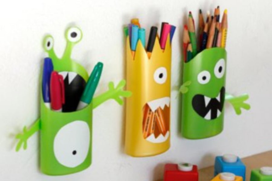 Ống hút còn có thể làm thành hộp đựng bút cho những đứa trẻ trong nhà để làm tăng thêm sinh động không gian học của trẻ. Bạn chỉ việc ghép và dán những ống hút cùng chiều dài xung quanh một chai nhựa được cắt đôi (hoặc lon sữa bò, ly cũ…), sau đó dùng dây ruy băng để tạo thành một chiếc nơ xinh đẹp.
