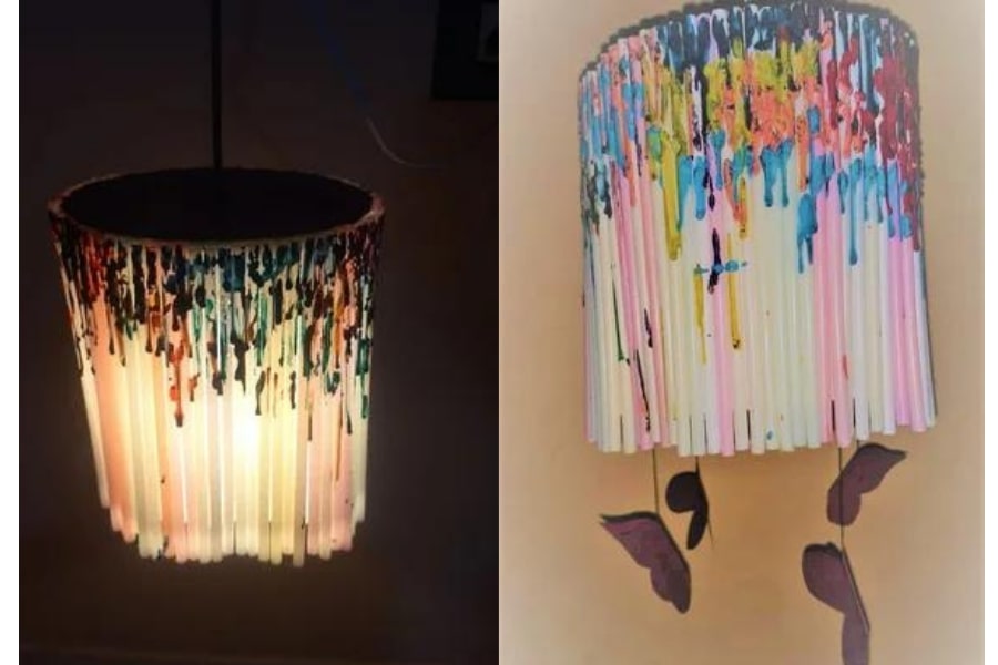 Bạn cần gắn những chiếc ống hút đầy màu sắc lên phía bên ngoài của chụp hoặc nắp đèn của chiếc đèn trong phòng ngủ. Hãy nhớ dán ống hút khít vào nhau và phối màu thật lung linh nha.