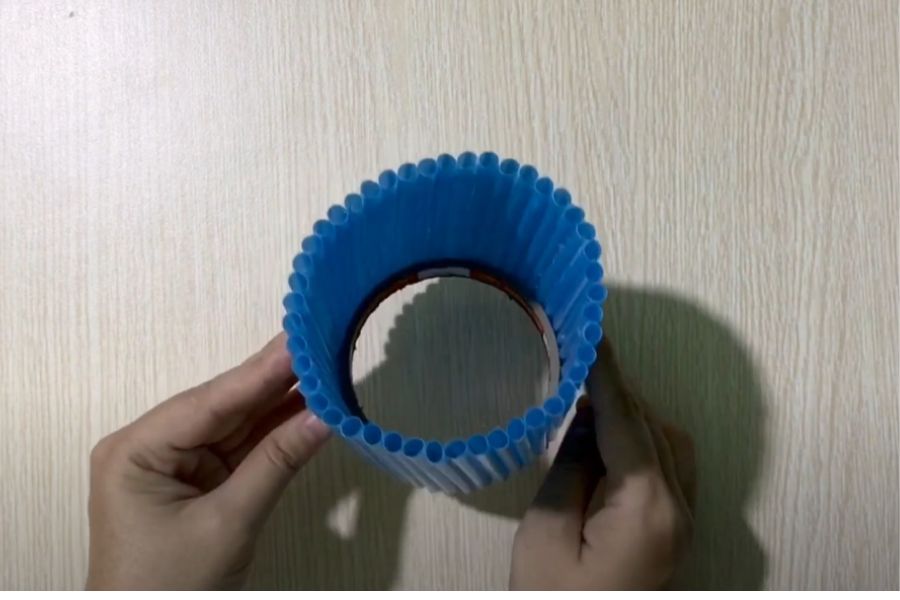Bước 2: Bạn dùng keo dính chặt ống hút vào xung quanh lõi băng keo
