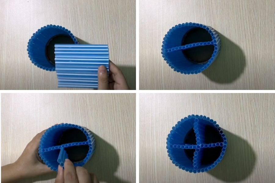 Bước 4: Bạn dùng keo dính chặt ống hút lại để tạo thành vách ngăn cho hộp đựng bút.