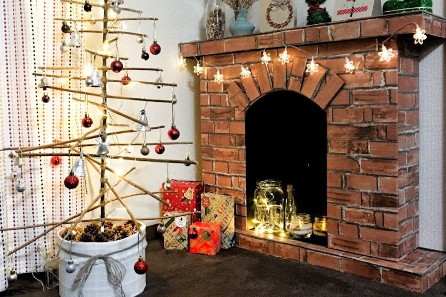 - Bước 7: Đặt lò sưởi và cố định vào góc tường. Sau đó, trang trí lò sưởi thêm lung linh bởi các đồ dùng và vật dụng như găng tay, tất chân, quả cầu Giáng Sinh, khăn trải,…