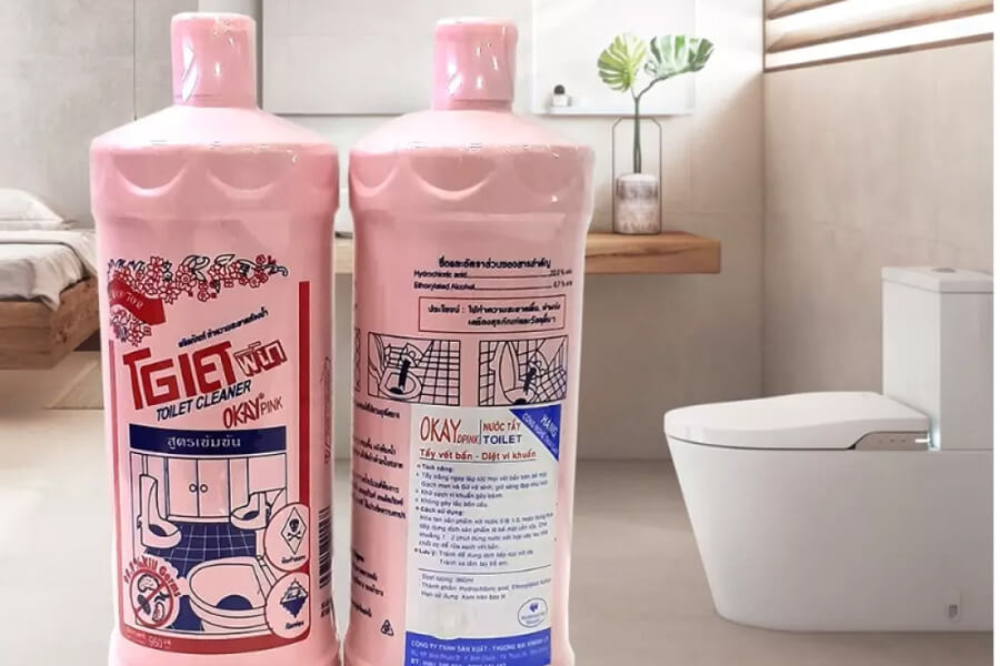 Cách đầu tiên và cũng là cách được nhiều người áp dụng nhất chính là dùng các chất tẩy rửa chuyên biệt dành cho sàn nhà vệ sinh như: nước tẩy Okay Pink của Thái Lan, Vim, Cif, Duck, Somos,… Những chất này đã được các nhà sản xuất nghiên cứu kỹ lưỡng dựa trên các đặc tính của vết bẩn nhà tắm. Chính vì thế, nước tẩy rửa này sẽ giúp bạn dễ dàng loại bỏ các vết bẩn dù là cứng đầu nhất.