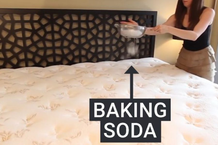 - Sau đó rắc Baking Soda lên những chỗ ẩm ướt của nệm.