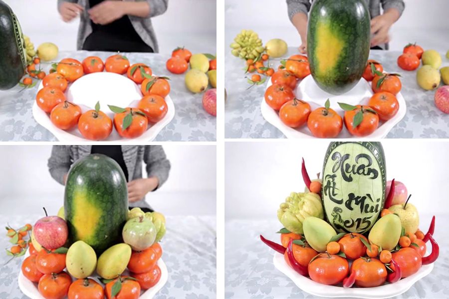- Bước 1: Chọn một quả dưa hấu lớn, có khắc chữ đặt ở giữa mâm làm trung tâm.