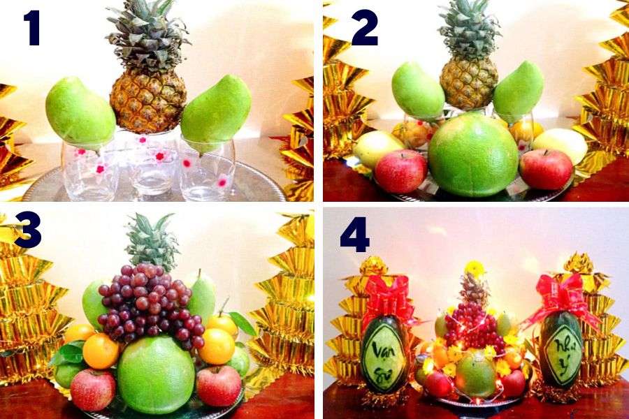 Cách bày trí này hàm chứa sự cân đối, hòa hợp, mang đến niềm tin vào một khởi đầu tràn đầy phúc lộc. Trình tự sắp xếp mâm ngũ quả như sau:
