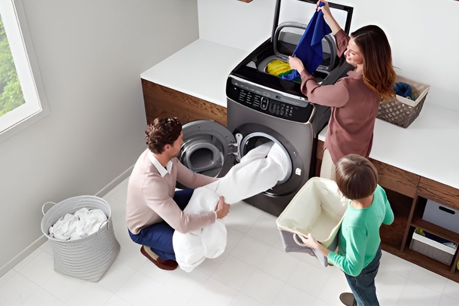 - Tính linh hoạt cao: Bạn có thể giặt và sấy riêng biệt hoặc cùng một lúc, tuỳ thuộc vào nhu cầu của bạn giúp tiết kiệm thời gian. Ngoài ra, máy giặt 2 ngăn cũng đi kèm với các tính năng tiện lợi như khóa trẻ em, chế độ giặt nhanh và khả năng điều chỉnh nhiệt độ và tốc độ quay.