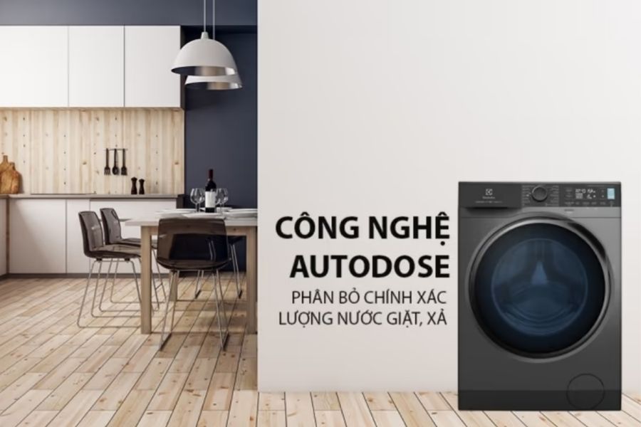 Công nghệ AutoDose của Electrolux làm phân bổ nước giặt và nước xả thông minh theo khối lượng quần áo, không cần cân trọng lượng. Điều này giúp giặt sạch và bảo vệ sợi vải hiệu quả, đồng thời tiết kiệm nước và nước xả.