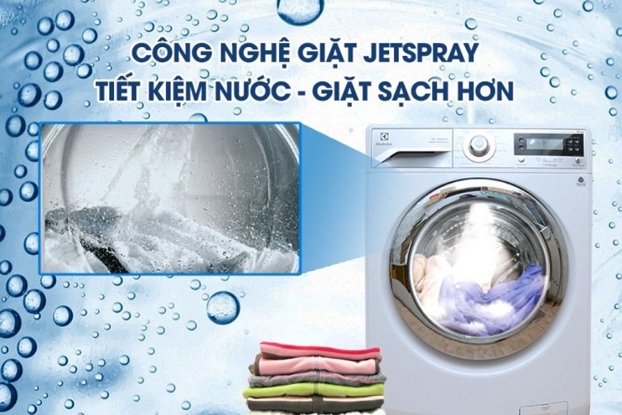 Công nghệ Jetspray có tác dụng giúp dòng nước thông qua bơm tuần hoàn, phun nước đều lên áo quần thông qua vòi phun ở cửa trước. Điều này giúp hòa tan bột giặt tốt hơn và giặt sạch hiệu quả hơn. Công nghệ này còn giúp tiết kiệm nước và giảm thời gian giặt.